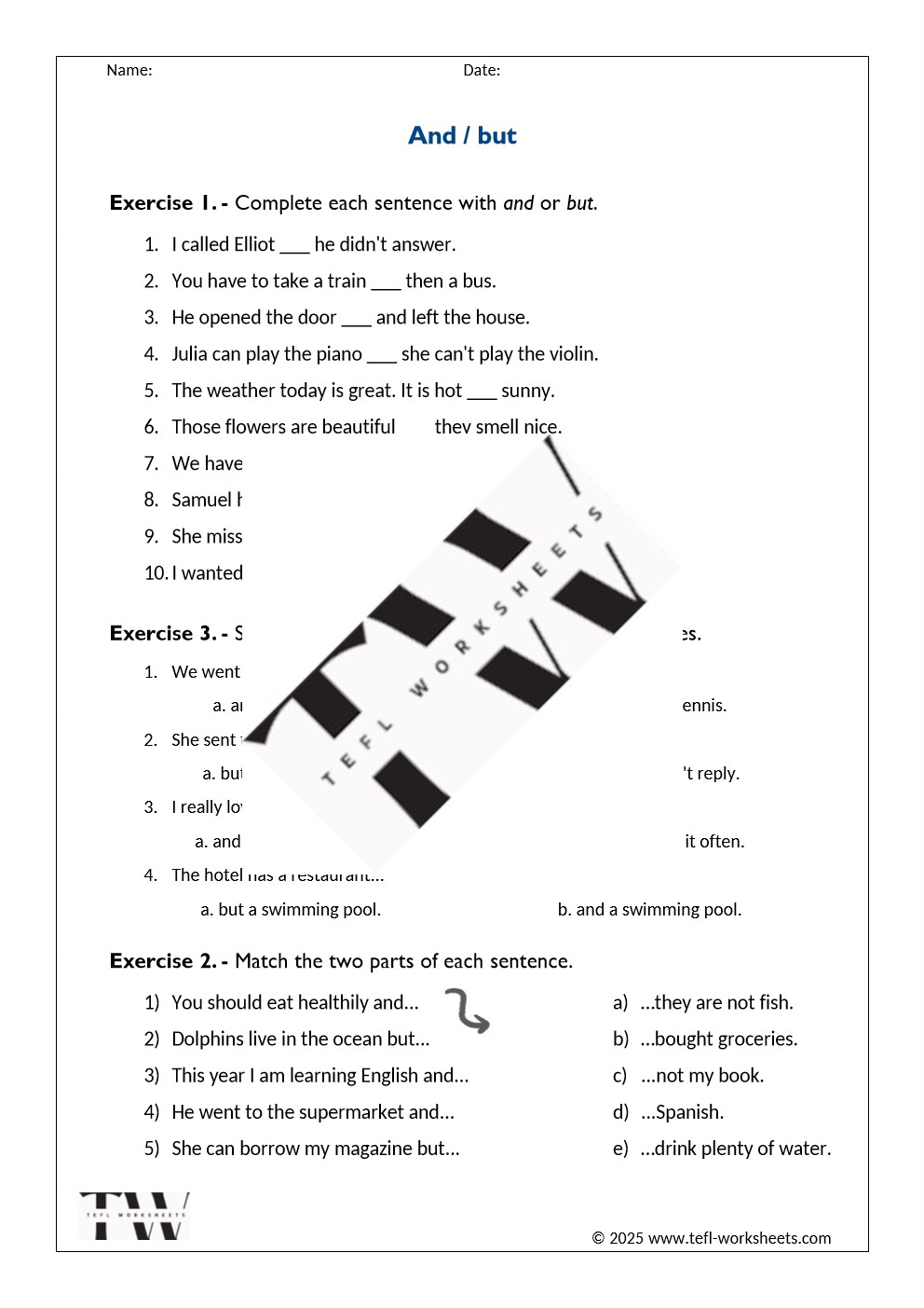For a worksheet on the conjunctions and, but, so, as, because, see conjunctions.