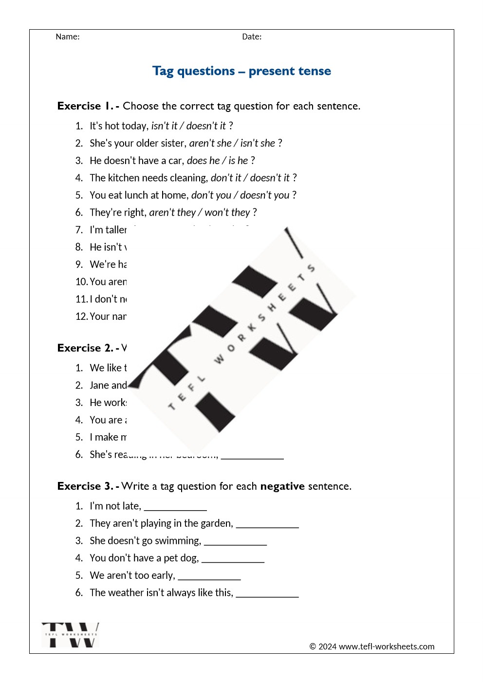 For a worksheet on the use of tag questions in the past tense see tag questions – past tense.